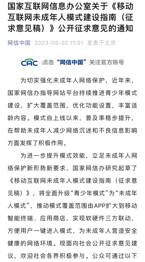 央廣網(wǎng)北京8月3日消息(總臺(tái)中國(guó)之聲記者馮爍)據(jù)中央廣播電視總臺(tái)中國(guó)之聲報(bào)道,為進(jìn)一步幫助未成年人減少網(wǎng)絡(luò)沉迷和不良信息影響,國(guó)家網(wǎng)信辦8月2日發(fā)布了關(guān)于《移動(dòng)互聯(lián)網(wǎng)未成年人模式建設(shè)指南(征求意見(jiàn)稿)》(以下簡(jiǎn)稱《指南》)公開(kāi)征求意見(jiàn),將未成年人網(wǎng)絡(luò)保護(hù)的覆蓋范圍由App擴(kuò)大到移動(dòng)智能終端、應(yīng)用程序、分發(fā)平臺(tái),把“青少年模式”升級(jí)為“未成年人模式”。相關(guān)部門如何給未成年人網(wǎng)絡(luò)保護(hù)設(shè)置護(hù)欄?