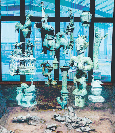 為保證三星堆新出土重器能在新館陳列中與觀眾見(jiàn)面,以及下一步文物保護(hù)和研究工作順利開(kāi)展,新館采用了數(shù)字化修復(fù)演示的新展陳方式。