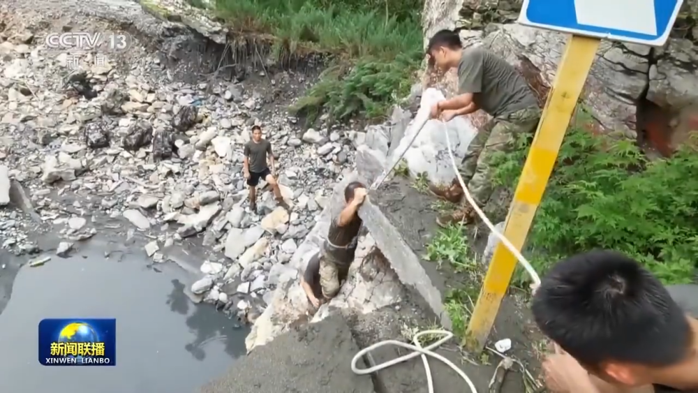 某抗洪搶險應急通信保障任務分隊指揮員 于林平:準備上去的時候,下面的那個路突然塌方了,我整個人就像吊單杠一樣,整個給我拉直了,然后我的戰(zhàn)友把我拉上來了。下面全部是碎石,水流非常湍急,非常有可能會被沖下去。