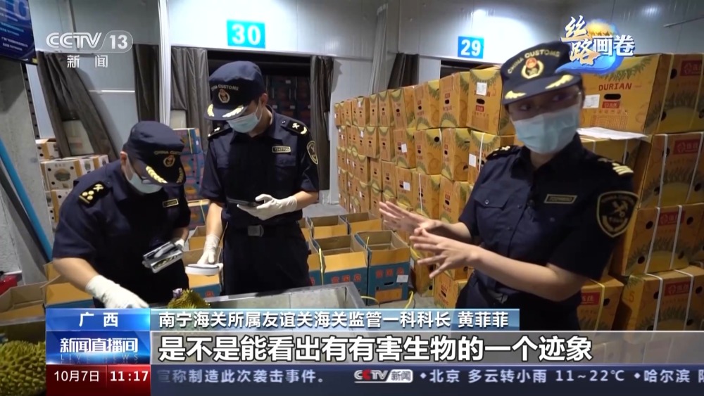 南寧海關所屬友誼關海關監(jiān)管一科科長 黃菲菲:現(xiàn)在他們主要查驗的就是榴蓮的外表面,是不是能看出有有害生物的一個跡象。當然他們同時還會對貨證相符性和證證相符性進行一個全面的檢查。比如說您看這個就是越南方面開出來的植物檢疫證書,就是為了保證榴蓮又快又好地進入國內(nèi)市場,然后讓我們的消費者能夠安心地食用。