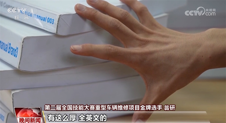 第二屆全國技能大賽重型車輛維修項目金牌選手 翁研:其實(shí)這次比賽的車型在一個月前才公布,而且全都是全新的車型,像我們比賽的資料(一個模塊)有2700多頁,這么厚,全英文的。