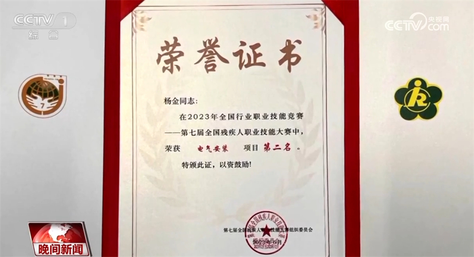 今年,在取得第七屆全國殘疾人職業(yè)技能大賽參賽資格后,楊金每天都堅持12小時的高強(qiáng)度訓(xùn)練,最終在電氣安裝項目上拿到了銀牌。