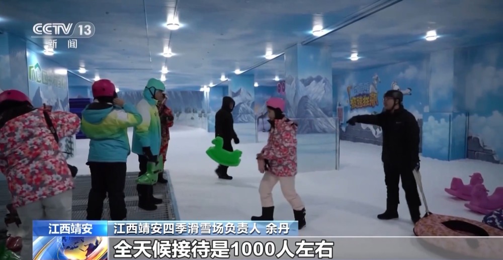 江西靖安四季滑雪場負(fù)責(zé)人 余丹:我們(滑雪場)占地面積5000平方米,擁有滑雪區(qū)、娛雪區(qū),單場可以接待人次是200個人左右,全天候接待是1000人左右。