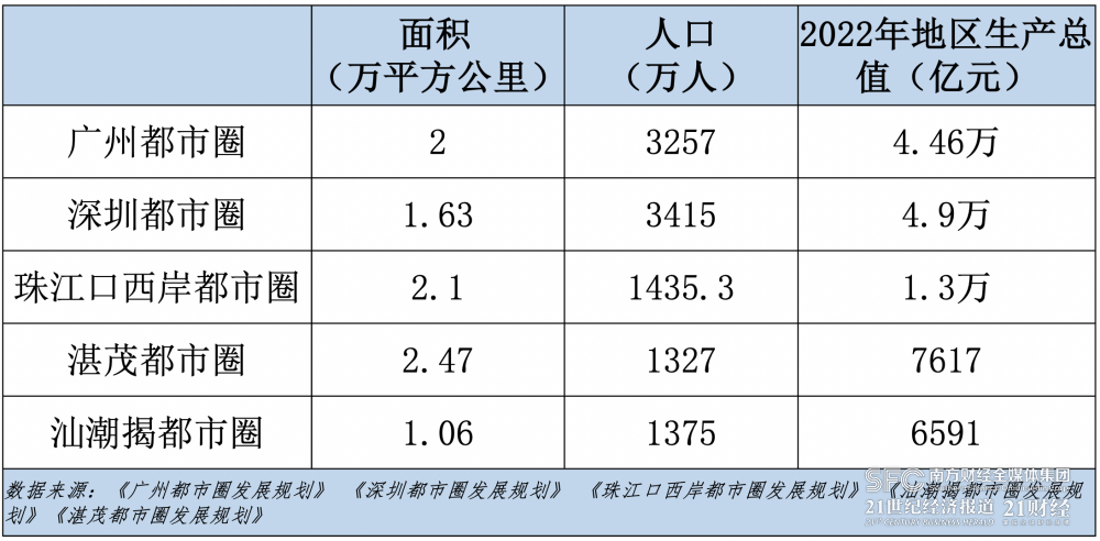 “都市圈是開(kāi)放的‘圈’,是市場(chǎng)聯(lián)系和社會(huì)分工更密集的概念?!标慀櫽钕蛴浾弑硎?,都市圈的提出是為了協(xié)調(diào)城鄉(xiāng)發(fā)展,通過(guò)動(dòng)態(tài)調(diào)整規(guī)劃不斷增強(qiáng)都市圈新內(nèi)涵,將釋放廣東省區(qū)域經(jīng)濟(jì)發(fā)展的新質(zhì)生產(chǎn)力。據(jù)公開(kāi)數(shù)據(jù)顯示,2022年,廣州都市圈地區(qū)生產(chǎn)總值4.46萬(wàn)億元,深圳都市圈4.9萬(wàn)億元,珠江口西岸都市圈1.3萬(wàn)億元,汕潮揭都市圈7617億元,湛茂都市圈6591億元,合計(jì)12.08萬(wàn)億元。