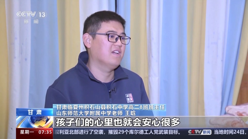 甘肅臨夏州積石山縣積石中學(xué)高二8班班主任、山東師范大學(xué)附屬中學(xué)老師 王晗:當(dāng)時(shí)著急的時(shí)候也沒(méi)有穿襪子,也沒(méi)有穿褲子,就穿了一條秋褲就出去了,就抓緊往學(xué)校跑,大約是15分鐘后我們就趕到了學(xué)校。在學(xué)生心目中,班主任在和班主任不在絕對(duì)是兩個(gè)樣,我往那一站,孩子們的心里也就會(huì)安心很多。當(dāng)然了孩子們都在,我心里也安心得多。