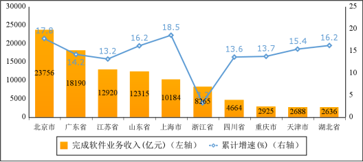 主要軟件大省收入占比持續(xù)提升。1—11月份,軟件業(yè)務收入居前5名的省份中,北京市,廣東省,江蘇省,山東省,上海市軟件收入分別為23756億元、18190億元、12920億元、12315億元和10184億元,分別增長17.8%、14.2%、13.2%、16.2%和18.5%,五省(市)合計軟件業(yè)務收入77365億元,占全國比重為70%,占比較去年同期提高1.2個百分點。