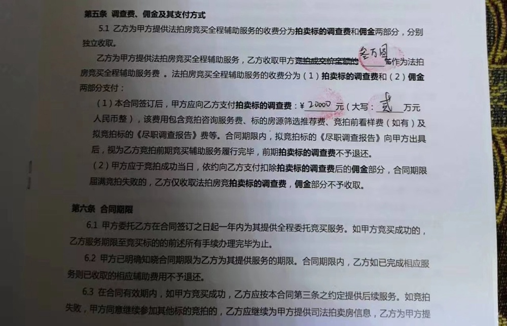 最終,中介口中30萬出頭就可以拿下的房子,被加價到了39萬,李先生放棄了競拍。他算了一筆賬,按最終成交價再加上各種費用,這套法拍房不低于同戶型的二手房價格。房子沒拍到,之前交的兩萬元“調(diào)查費”也打了水漂。在李先生給記者提供的雙方合同中,有這樣的約定:“合同期限內(nèi),擬競拍標(biāo)的《盡職調(diào)查報告》向甲方出具后,視為乙方競拍前期競買輔助服務(wù)履行完畢,前期拍賣標(biāo)的‘調(diào)查費’不予退還”。