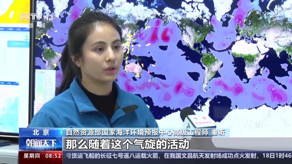 自然資源部國家海洋環(huán)境預(yù)報(bào)中心高級工程師 秦聽:那么隨著這個(gè)氣旋的活動(dòng),就會(huì)造成這種南半球的中低緯度的暖濕氣流,與南極的冷氣團(tuán)之間的碰撞,所形成的這種極地的降雪,以及海霧這種低能見度的一個(gè)情況,并且會(huì)引起它作業(yè)海區(qū)的一個(gè)大風(fēng)、海浪的這種高海況天氣。