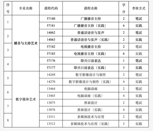 3. 調整播音與主持藝術專業(yè)(專升本)、數字媒體藝術專業(yè)(專升本)2個專業(yè)中8門課程(見下表),筆試和實踐均納入到“非筆試及實踐類課程”進行報考,由主考學校組織考試。