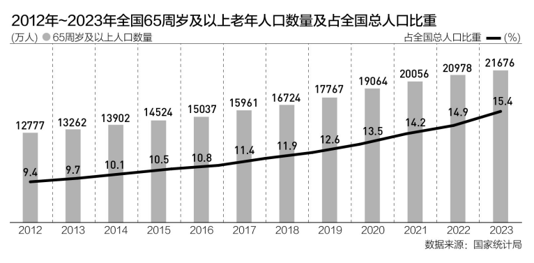 國家統(tǒng)計局發(fā)布最新人口數據顯示,60歲及以上人口29697萬人,占全國人口的21.1%,其中65歲及以上人口21676萬人,占全國人口的15.4%。根據聯(lián)合國關于老齡化的劃分標準,我國已經進入了中度老齡社會。