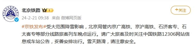 中新網(wǎng)2月21日電 據(jù)中國鐵路北京局集團有限公司官方微博消息,受大范圍降雪影響,北京局管內京廣高鐵、京滬高鐵、石濟客專、石太客專等部分線路旅客列車晚點運行。