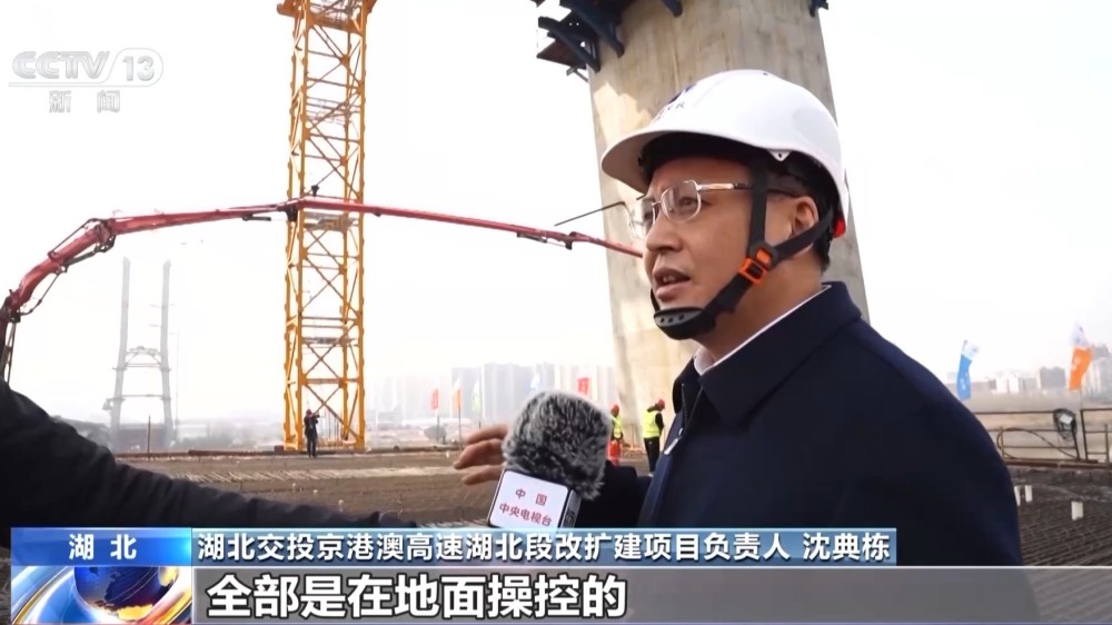 湖北交投京港澳高速湖北段改擴(kuò)建項(xiàng)目負(fù)責(zé)人 沈典棟:這個塔頂上就是輕型智能筑塔機(jī),是采用智能建造的技術(shù),全都是在地面操控的,塔上無人,這樣就保證了我們工人安全。我們這個智能的布料系統(tǒng),布料很均勻,讓混凝土不產(chǎn)生離析。