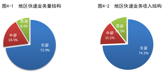 1-2月,東、中、西部地區(qū)快遞業(yè)務(wù)量比重分別為72.9%、18.5%和8.6%,業(yè)務(wù)收入比重分別為74.3%、15.2%和10.5%。與去年同期相比,東部地區(qū)快遞業(yè)務(wù)量比重下降2.2個百分點(diǎn),快遞業(yè)務(wù)收入比重下降1.2個百分點(diǎn);中部地區(qū)快遞業(yè)務(wù)量比重上升1.5個百分點(diǎn),快遞業(yè)務(wù)收入比重上升0.7個百分點(diǎn);西部地區(qū)快遞業(yè)務(wù)量比重上升0.7個百分點(diǎn),快遞業(yè)務(wù)收入比重上升0.5個百分點(diǎn)。