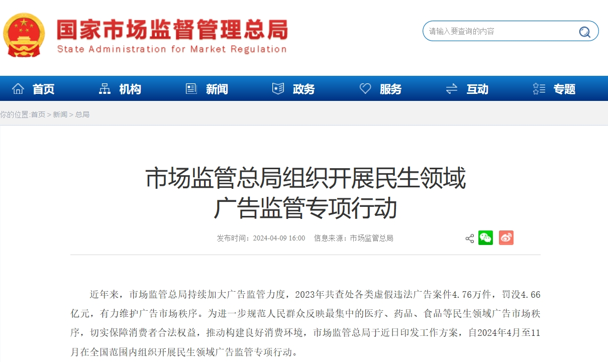 央廣網北京4月9日消息(記者 果君)國家市場監(jiān)督管理總局于近日印發(fā)工作方案,自2024年4月至11月在全國范圍內組織開展民生領域廣告監(jiān)管專項行動。