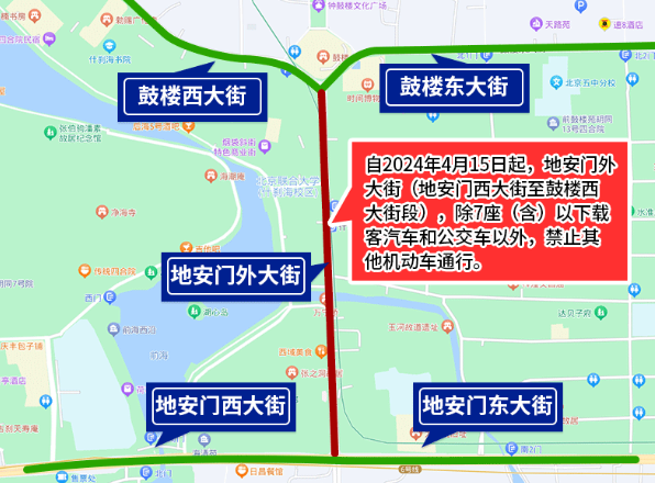 為確保全國重點文物保護(hù)單位“大運河——玉河故道(澄清上閘含萬寧橋)”的文物安全與交通安全,根據(jù)文物保護(hù)和道路交通安全有關(guān)法律法規(guī)規(guī)定,決定自2024年4月15日起,地安門外大街(地安門西大街至鼓樓西大街段),除7座(含)以下載客汽車和公交車以外,禁止其他機(jī)動車通行。