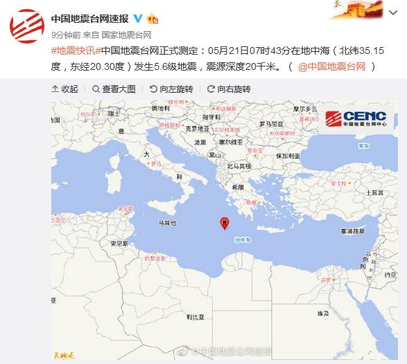 中新網(wǎng)5月21日電 據(jù)中國地震臺(tái)網(wǎng)正式測定:5月21日7時(shí)43分在地中海(北緯35.15度,東經(jīng)20.30度)發(fā)生5.6級地震,震源深度20千米。