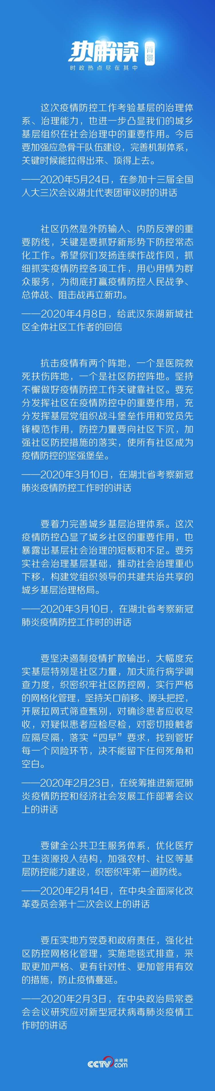 習近平在后來的講話中強調(diào),要“堅持常態(tài)化精準防控和局部應急處置有機結(jié)合,加強社區(qū)精準防控”,“健全疾控機構(gòu)與城鄉(xiāng)社區(qū)聯(lián)動工作機制,加強鄉(xiāng)鎮(zhèn)衛(wèi)生院和社區(qū)衛(wèi)生服務中心疾病預防控制職責,夯實聯(lián)防聯(lián)控的基層基礎”。
