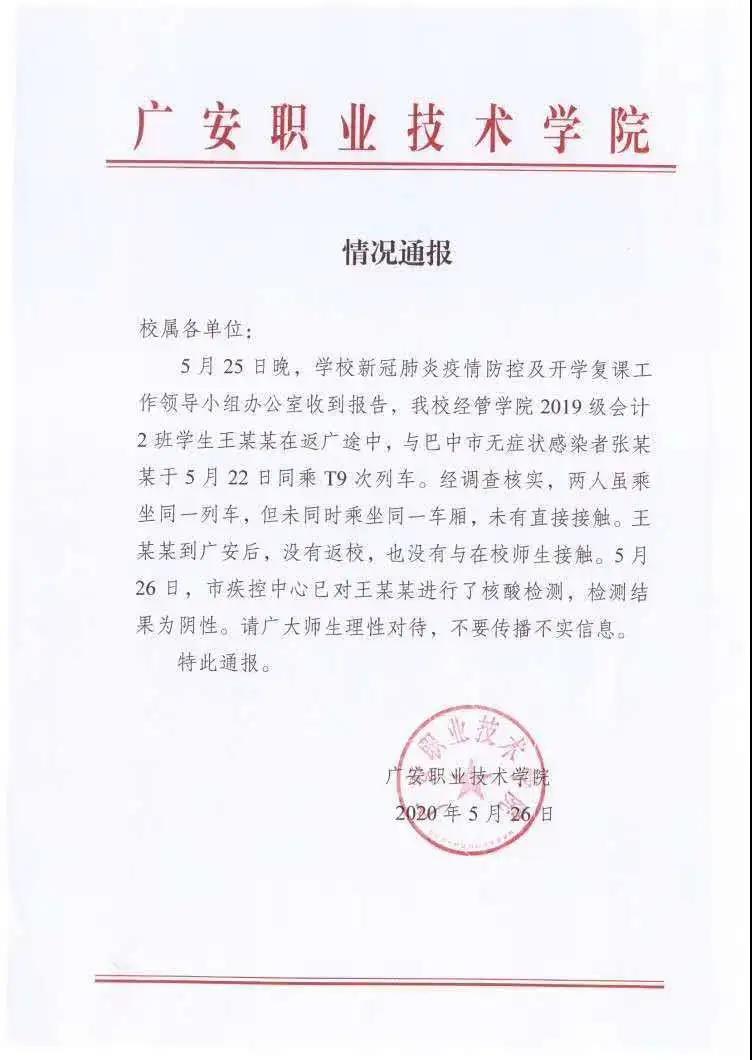 公告稱, 5月25日晚,廣安職業(yè)技術學院新冠肺炎疫情防控及開學復課工作領導小組辦公室收到報告,該校經(jīng)管學院2019級會計2班學生王某某在返廣(安)途中,與巴中市無癥狀感染者張某某于5月22日同乘T9次列車。經(jīng)調查核實,兩人雖乘坐同一列車,但未同時乘坐同一車廂,未有直接接觸。王某某到廣安后,沒有返校,也沒有與在校師生接觸。5月26日,廣安市疾控中心對王某某進行核酸檢測,檢測結果為陰性。