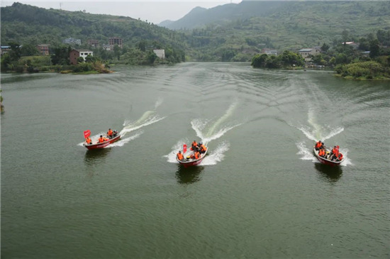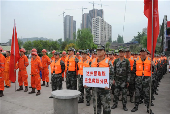 下午15時,大竹縣烏木水庫大堤上,200余名預備役官兵身著橘色救生衣集結完畢,應急分隊的紅旗迎風招展,機關各科協(xié)調(diào)的保障力量也源源不斷往集結地域開進。15時20分,應急分隊已到達指定地域,救援物資全部到位。