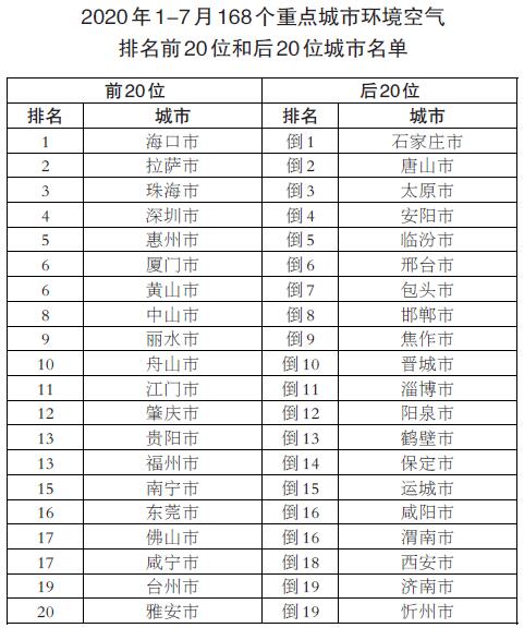 1-7月,168個重點(diǎn)城市中石家莊、唐山和太原市等城市空氣質(zhì)量相對較差;海口、拉薩、珠海市等城市空氣質(zhì)量相對較好。