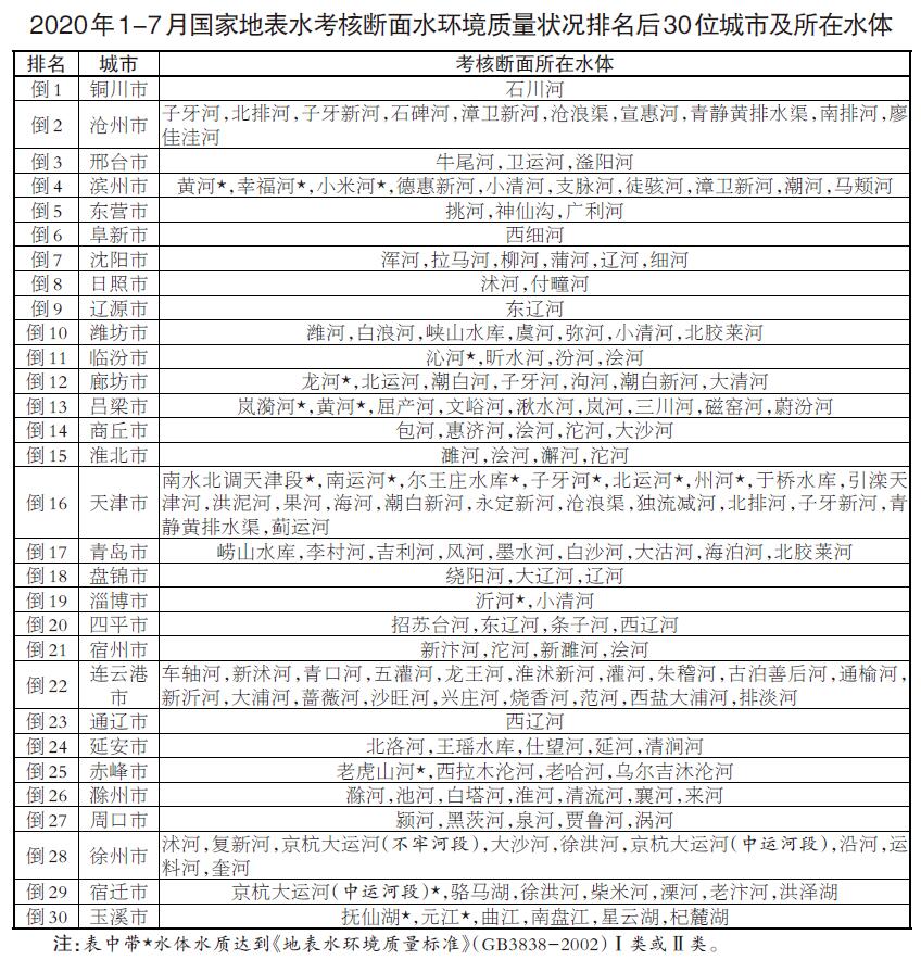 參加排名的全國地級及以上城市,覆蓋2050個國控斷面(其中1940個為國家地表水考核斷面,110個為入??刂茢嗝妫?月,全國地級及以上城市中,河池、柳州、桂林等30個城市國家地表水考核斷面水環(huán)境質(zhì)量相對較好,滄州、鹽城、連云港等30個城市國家地表水考核斷面水環(huán)境質(zhì)量相對較差;1-7月,全國地級及以上城市中,張掖、金昌、柳州等30個城市國家地表水考核斷面水環(huán)境質(zhì)量相對較好,銅川、滄州、邢臺等30個城市國家地表水考核斷面水環(huán)境質(zhì)量相對較差。