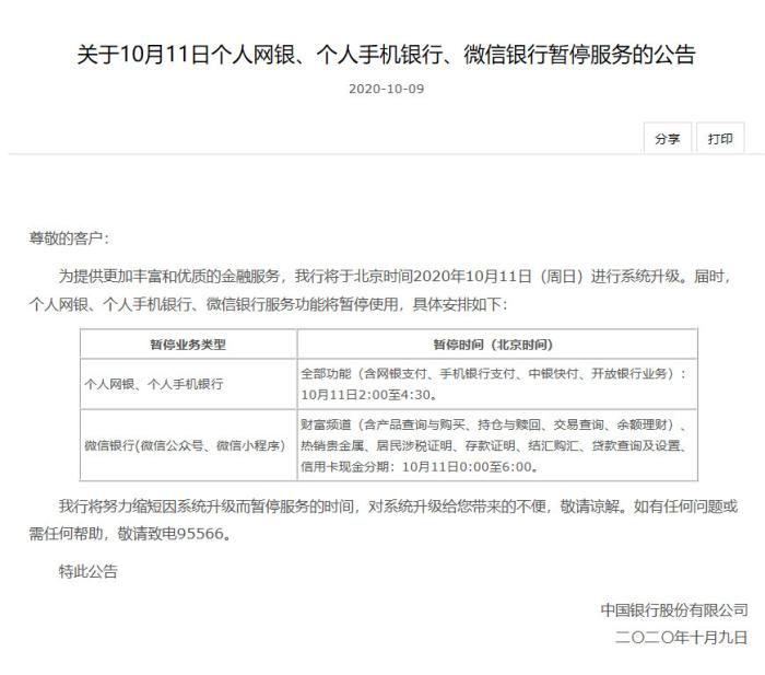 中國銀行11日暫停網(wǎng)銀和手機銀行服務(wù)