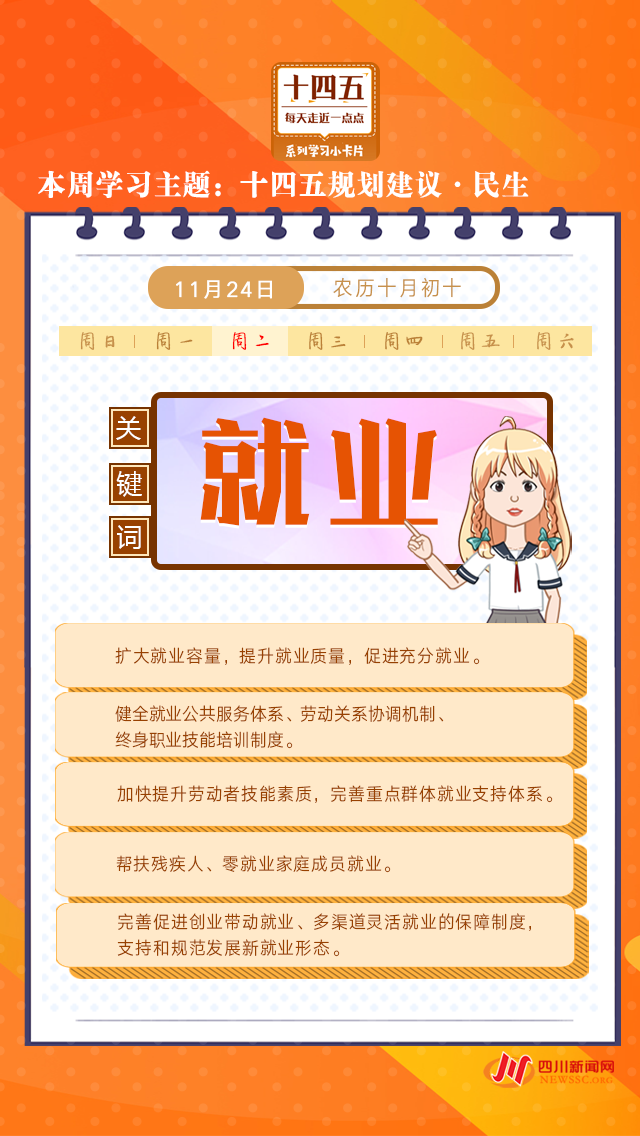 本周學(xué)習(xí)主題“十四五規(guī)劃建議·民生”系列,一張張學(xué)習(xí)卡帶你了解就業(yè)、收入、住房……那些與你息息相關(guān)的民生舉措!今天打卡學(xué)習(xí)“十四五”規(guī)劃建議中有關(guān)就業(yè)的舉措。