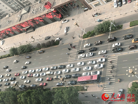 6月12日上午8時許,正值上班高峰期,石家莊市區(qū)主干道裕華路上,人多車多。裕華路與體育大街交口往東,北側(cè)是劍橋春雨小區(qū),南側(cè)是方北小區(qū),兩個小區(qū)門口正對裕華路的半幅機動車道上分別畫著斑馬線。因為附近有學(xué)校,南北兩側(cè)陸陸續(xù)續(xù)有送孩子的家長或騎車人從斑馬線通過裕華路。每當有人通過斑馬線時,裕華路上的汽車都會停下來等候。由于行人三五成群,不斷通過,路上的汽車不得不繼續(xù)等候,以至于排起了長龍。