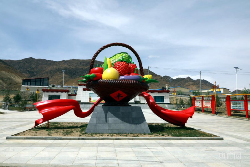 蔬菜籃雕塑立在阿亞村口(央廣網記者 唐磊 攝)