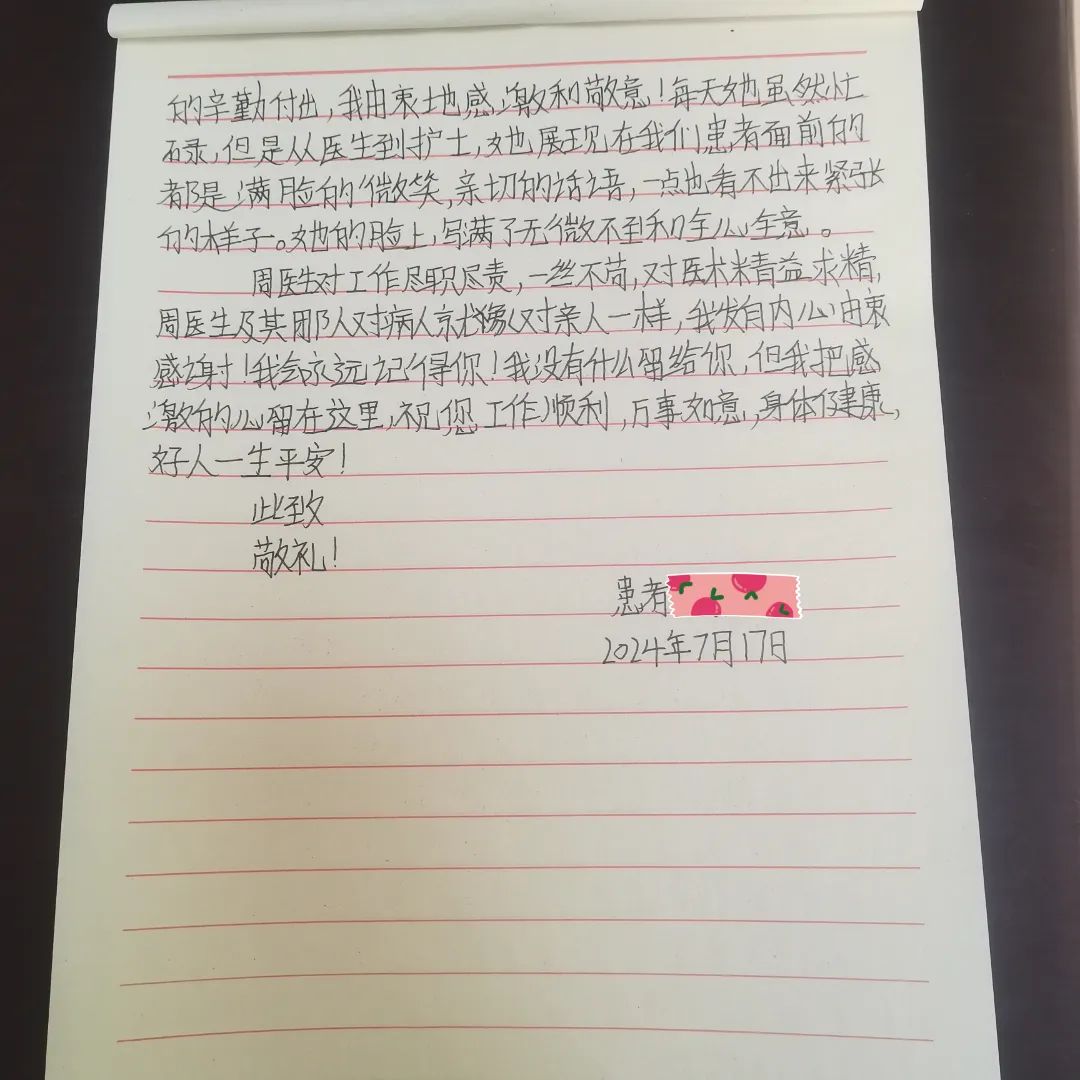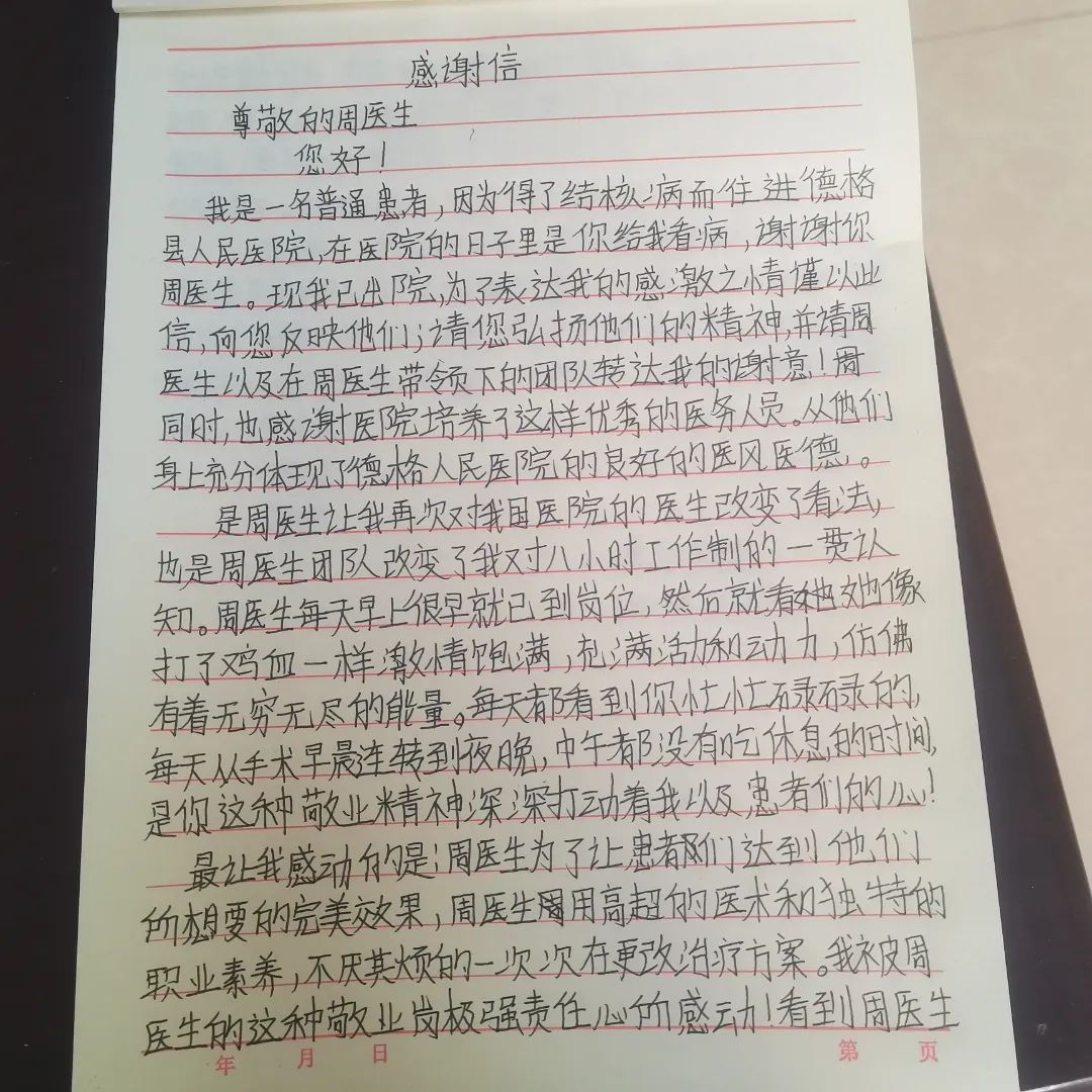 7月1日,一名在德格縣人民醫(yī)院就診的結(jié)核患者向成都市公共衛(wèi)生臨床醫(yī)療中心援藏醫(yī)師周瑜送來(lái)了一封感謝信,在信中,患者對(duì)周瑜醫(yī)生及其團(tuán)隊(duì)在住院期間給予她的積極診治和熱情關(guān)懷表示感謝,并對(duì)科室團(tuán)隊(duì)的診療技術(shù)和治療的預(yù)后效果都作出了非常高的評(píng)價(jià)。