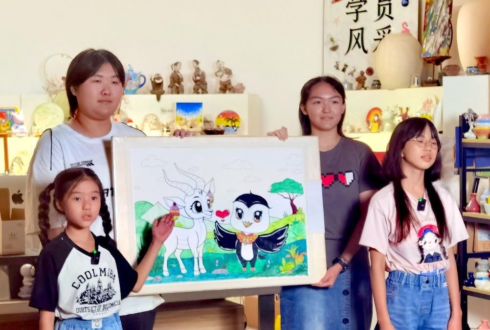 活動期間,北京的劉心語、吳梓菡、文藝、吳辰希與西藏的旦增雍措、旦增尼瑪、徐杰、索朗央珍等兩地青少年代表,通過“同繪一幅畫”的方式,將西藏的藏羚羊與北京的雨燕巧妙地融合在一個畫面之中。畫作中,一邊是象征北京自由與活力的“空中旅行家”雨燕在無邊的藍(lán)天中翱翔,另一邊則是代表西藏堅(jiān)韌與生機(jī)的藏羚羊在遼闊的無人區(qū)自由奔跑。盡管兩者習(xí)性迥異、棲息地不同,它們共同展現(xiàn)了自由無束的特質(zhì),寓意著京藏兩地青少年盡管生活在不同的文化環(huán)境中,卻都能追求自由和快樂的成長。正如北京的孩子們說:“我們把來自拉薩的藏羚羊和來自北京的小雨燕聚集到一起,畫在了一個畫面中??矗翰亓缪虼髦刈宥棧∮暄嗌碇祁I(lǐng)服飾,她們是盛裝出席啊。就像我們,北京和西藏的同學(xué)們,手拉著手,心連著心,書信往來,學(xué)習(xí)探究,相互幫助,一起成長?!蔽鞑氐暮⒆诱f:“我們就像畫中的藏羚羊和北京雨燕一樣,心手相牽,互相鼓舞,用積極的態(tài)度學(xué)習(xí)、生活,成為祖國的好少年!”。
