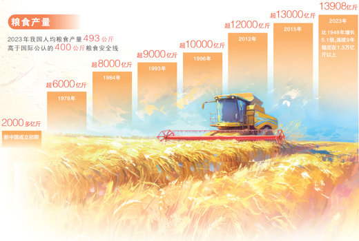 豐收成色十足?!安丶Z于地、藏糧于技”戰(zhàn)略深入實施,我國糧食綜合生產(chǎn)能力穩(wěn)步提升,連續(xù)9年穩(wěn)定在1.3萬億斤以上。截至2023年,全國綠色、有機、名特優(yōu)新和地理標(biāo)志農(nóng)產(chǎn)品認(rèn)證登記總數(shù)達到7.5萬個。蔬菜水果品種琳瑯滿目,居民的“菜籃子”“果盤子”更加豐富。