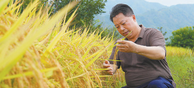 溫明生查看水稻長勢。記者 王 丹攝
