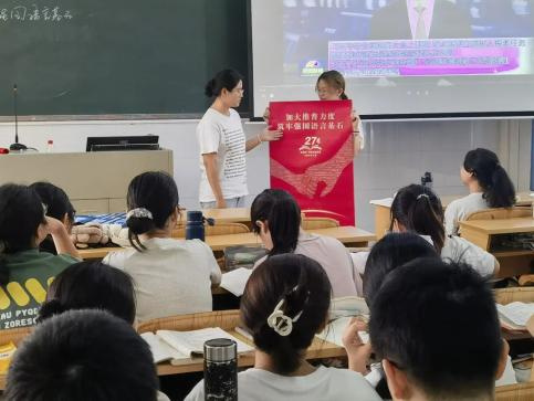 嶺南師范學(xué)院《教師語(yǔ)言》課程組負(fù)責(zé)人韓芳芳,兼任教育科學(xué)學(xué)院23小教6班班主任。她將課程教學(xué)與班級(jí)管理工作相結(jié)合,通過課程專業(yè)引領(lǐng)和支撐,組織學(xué)生參與全國(guó)第27屆普通話宣傳周,并攜手中秋佳節(jié),于9月13日晚舉辦了推普特色班會(huì),以生動(dòng)活潑的形式普及國(guó)家通用語(yǔ)言文字知識(shí),開創(chuàng)新學(xué)期之新氣象。教科院黨委副書記陳理才應(yīng)邀參加了此次班會(huì)。
