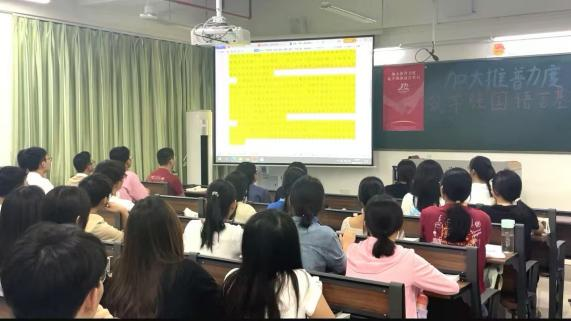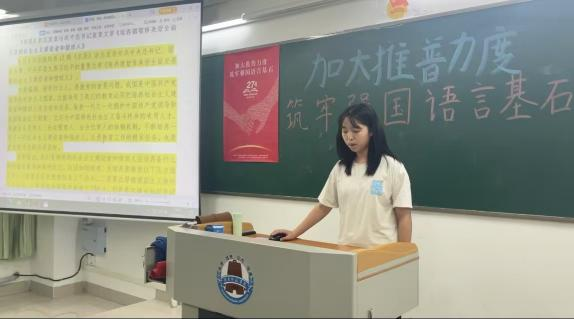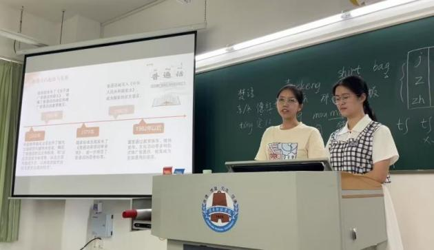新學(xué)期伊始,《教師語(yǔ)言》課程教學(xué)團(tuán)隊(duì)將推普宣傳與課程的“音韻筑基”內(nèi)容相結(jié)合,理論層面講解我國(guó)通用語(yǔ)言文字的相關(guān)法律政策和普通話聲、韻、調(diào)等基礎(chǔ)知識(shí);實(shí)踐層面指導(dǎo)學(xué)生利用中國(guó)語(yǔ)言文字?jǐn)?shù)字博物館、師圈小程序等課程資源進(jìn)行學(xué)習(xí),邀請(qǐng)學(xué)生介紹普通話的發(fā)展歷程和我國(guó)第27屆推普宣傳主題中所滲透的“強(qiáng)國(guó)必須強(qiáng)語(yǔ),強(qiáng)語(yǔ)助力強(qiáng)國(guó)”價(jià)值內(nèi)涵。