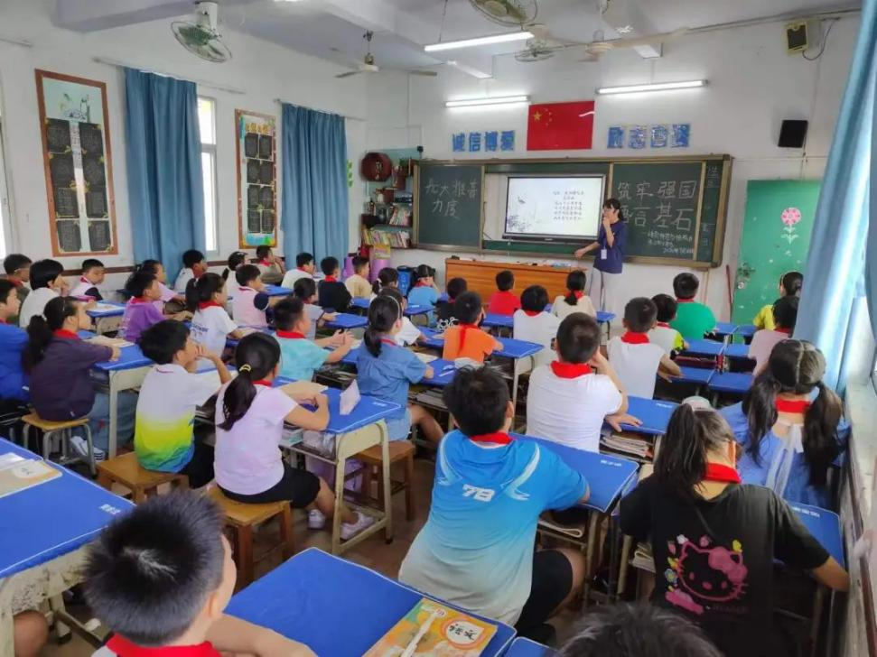 21級(jí)實(shí)習(xí)生戴鈺瑩在湛江市第四小學(xué)舉辦推普活動(dòng),將紅色經(jīng)典與傳統(tǒng)文化教育相結(jié)合,通過誦讀《西江月·井岡山》和《三字經(jīng)》,讓學(xué)生感受到革命先烈的英勇無畏,傳承了中華民族的傳統(tǒng)美德與智慧,增強(qiáng)了文化自信與民族自豪感。