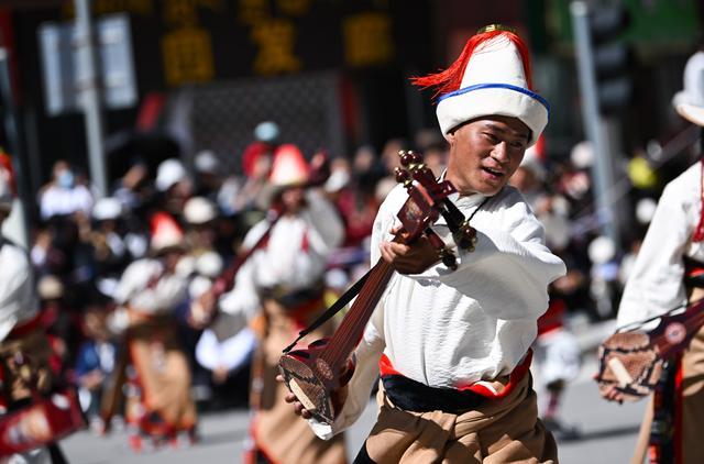 8月3日,在青海省果洛藏族自治州瑪沁縣,演員在慶祝果洛州成立70周年文藝展演活動上表演。新華社記者 張龍 攝