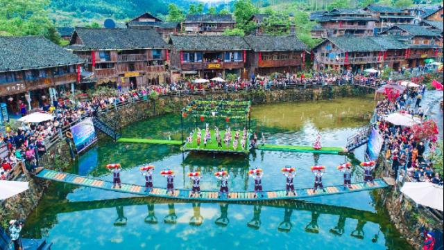 廣西投入中央財政少數(shù)民族發(fā)展資金1.6億元,打造民族村寨與鄉(xiāng)村旅游融合發(fā)展試點39個。圖為2024年4月廣西傳統(tǒng)民族節(jié)日“三月三”期間,來自全國的游客與夢嗚苗寨村民一起慶祝節(jié)日。廣西壯族自治區(qū)柳州市民宗委供圖