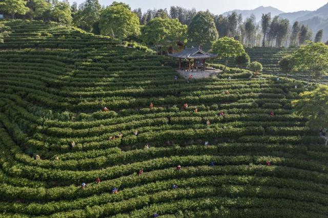 浙江省景寧畬族自治縣以國家民委“共同現(xiàn)代化試點”為抓手,積極促進農(nóng)文旅融合發(fā)展。圖為2021年4月30日,參賽隊員在景寧縣澄照鄉(xiāng)三石村惠明茶園參加采茶比賽(無人機照片)。新華社發(fā)(李肅人 攝)