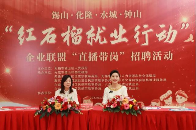 江蘇深入實施“紅石榴”就業(yè)行動。截至今年7月,全省13個設(shè)區(qū)市的410家企業(yè)累計面向民族地區(qū)各族群眾提供3.45萬個就業(yè)崗位。圖為江蘇省無錫市錫山區(qū)與貴州省六盤水市水城區(qū)、鐘山區(qū),青海省海東市化隆回族自治縣通過網(wǎng)絡(luò)平臺舉行“紅石榴就業(yè)行動”合作簽約暨企業(yè)聯(lián)盟“直播帶崗”招聘活動。江蘇省民族宗教事務(wù)委員會供圖