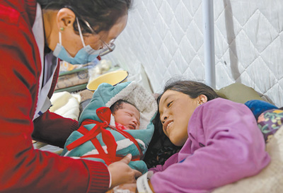 1月10日,日喀則市定日縣人民醫(yī)院婦產(chǎn)科醫(yī)生在照看一對(duì)母子。這名新生兒在9日剛剛出生。本報(bào)記者 張武軍攝