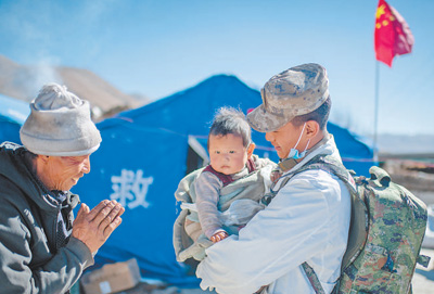 1月9日,在定日縣長(zhǎng)所鄉(xiāng)古榮村安置點(diǎn),受災(zāi)群眾感謝西藏軍區(qū)陸軍某部隊(duì)衛(wèi)生員的醫(yī)療救治。人民網(wǎng)記者 翁奇羽攝