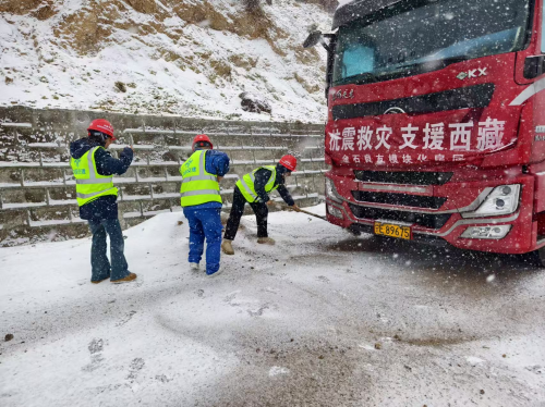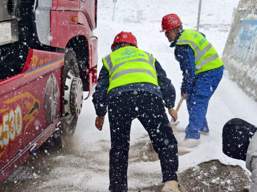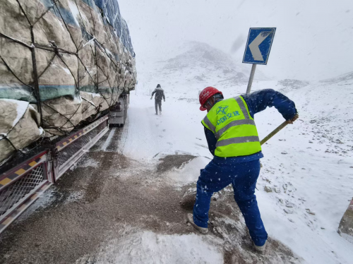 事發(fā)時,強(qiáng)降雪導(dǎo)致路面濕滑,卡車在行駛過程中出現(xiàn)打滑,甚至有滑坡的風(fēng)險(xiǎn)。駕駛員在緊急制動過程中,車輛失控,險(xiǎn)象環(huán)生。在這危急關(guān)頭,途經(jīng)此地的中交建設(shè)者們毫不猶豫地伸出援手。他們冒著嚴(yán)寒,鋪設(shè)碎石、沙子增加道路摩擦力。經(jīng)過一番艱苦努力,物資車輛終于緩緩駛離險(xiǎn)境。