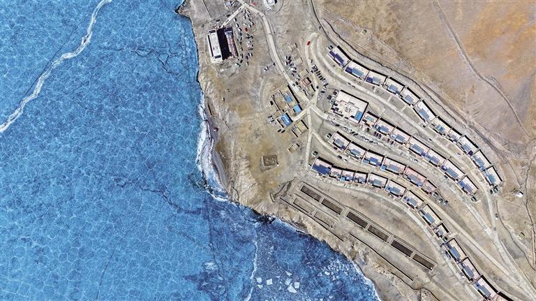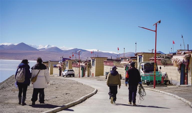 浪卡子縣打隆鎮(zhèn)推瓦村,南部與不丹接壤,邊界線長(zhǎng)達(dá)25公里,是世界上海拔最高的純牧業(yè)行政村之一。全村共有40戶人家,153位村民在此生活。2月6日,記者踏入推瓦村,首先映入眼簾的是遠(yuǎn)處的普姆擁措湖,湖面在陽(yáng)光的照耀下波光粼粼,與錯(cuò)落有致的雪山相互映襯,構(gòu)成一幅絕美的畫(huà)面。沿著平坦的柏油馬路前行,道路兩旁整齊排列的路燈和一排排以溫馨黃色為主色調(diào)的邊境小康房格外引人注目。漫步在臨近冰湖的村路上,悠然愜意之感油然而生,雪山、湖泊、村落與村民們和諧相融,共同繪就了一幅寧?kù)o祥和的鄉(xiāng)村畫(huà)卷。