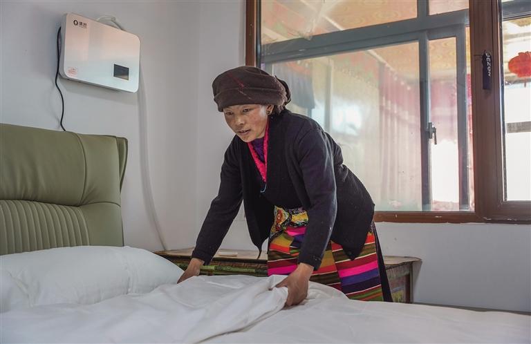 倫珠曲珍今年40歲,是這家的二女兒,15年前嫁到外村,每年都會(huì)回來(lái)看望父母。由于同行的人員出現(xiàn)高反癥狀,倫珠曲珍便主動(dòng)邀請(qǐng)記者到他們家的“高原暖心房”里休息調(diào)整。“高原暖心房”設(shè)置在她家客廳的里側(cè),屋內(nèi)寬敞明亮、干凈整潔。墻壁上的恒溫裝置讓屋子始終保持在宜人的20攝氏度左右?!拔覀兇蛟斓摹咴姆俊銣匦Ч貏e好,最高溫度能達(dá)到30多攝氏度。而且因?yàn)槭褂玫牟馁|(zhì)特殊,就算不開(kāi)恒溫裝置,幾個(gè)人待在屋里也不會(huì)覺(jué)得冷??纯催@些家具,都是村里愛(ài)心小屋提供的。”廖旭東介紹道。