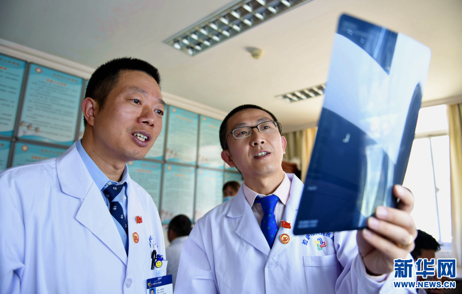 在拉薩市人民醫(yī)院骨科病房內(nèi),北京積水潭醫(yī)院的援藏醫(yī)生龔曉峰(右)和北京天壇醫(yī)院援藏醫(yī)生李家謀查看患者的X光片。(2017年8月3日攝)。新華社記者 晉美多吉 攝