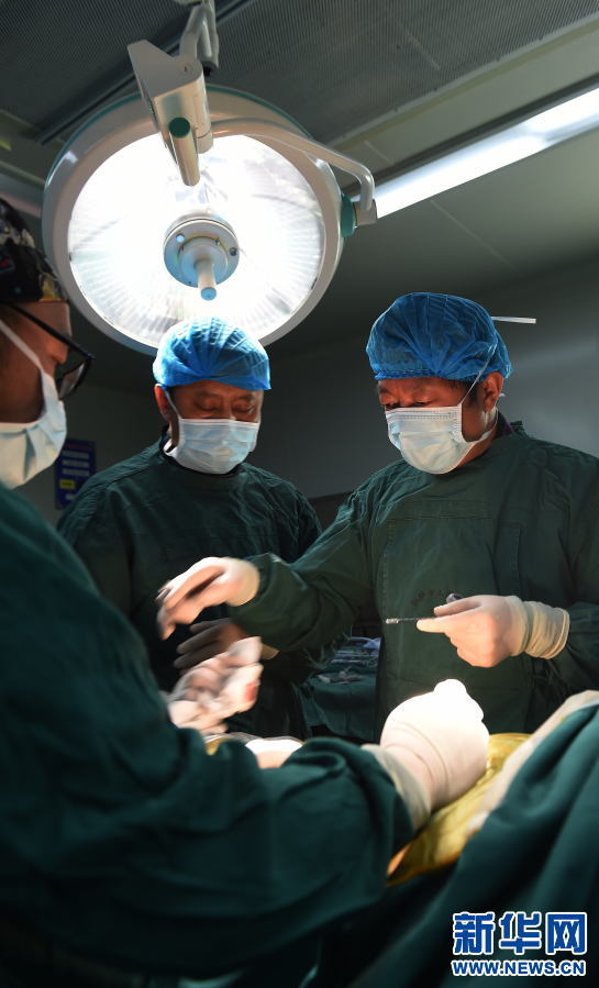 2017年5月26日,援藏醫(yī)生李家謀(右一)帶領(lǐng)拉薩市人民醫(yī)院的藏族醫(yī)生進(jìn)行脊柱微創(chuàng)手術(shù)。新華社記者 覺果 攝