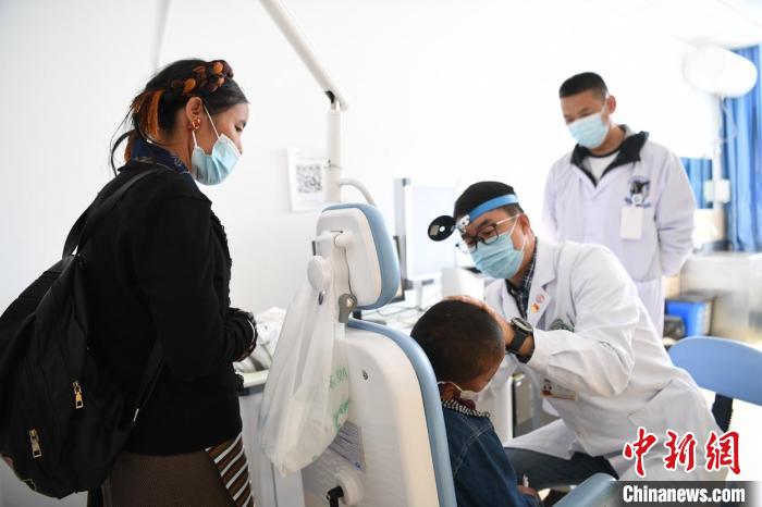 上海五官科醫(yī)院耳鼻喉科醫(yī)生曹鵬宇給藏族小朋友診病?!O國根 攝