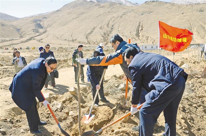 2012年,由山東省濰坊市第六批援藏工作隊(duì)具體負(fù)責(zé)的“湘河谷”經(jīng)濟(jì)林生態(tài)產(chǎn)業(yè)扶貧項(xiàng)目在南木林縣實(shí)施。項(xiàng)目集旅游觀光、苗木生產(chǎn)、林產(chǎn)品深加工、果品銷售于一體,總投資20億元,規(guī)劃面積10萬(wàn)畝。最終形成地方政府、當(dāng)?shù)厝罕姟⑵髽I(yè)共同受益的“全贏”局面。 圖為山東省濰坊市援藏干部正在栽植經(jīng)濟(jì)林木(2012年3月12日攝)。 (本版圖片均為資料圖片)