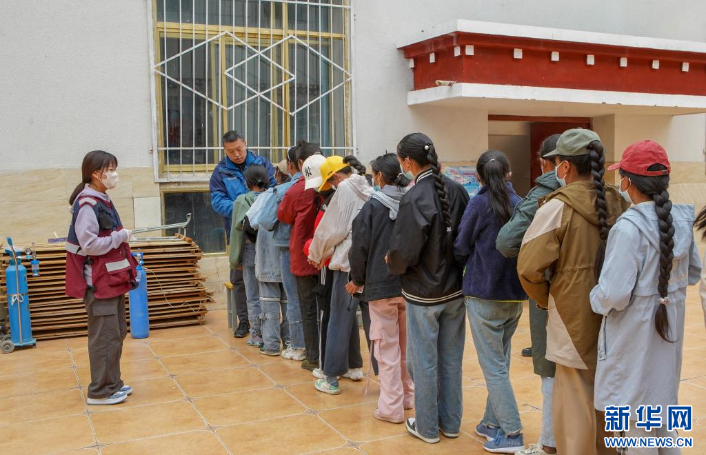 4日上午,在那曲市色尼區(qū)尼瑪鄉(xiāng)小學(xué)學(xué)生宿舍一樓大廳,學(xué)生們齊刷刷排成隊等待做心臟聽診?!奥犜\有問題的同學(xué),由老師帶去做心臟彩超。”領(lǐng)隊醫(yī)生耿直一邊吸氧一邊聽診。